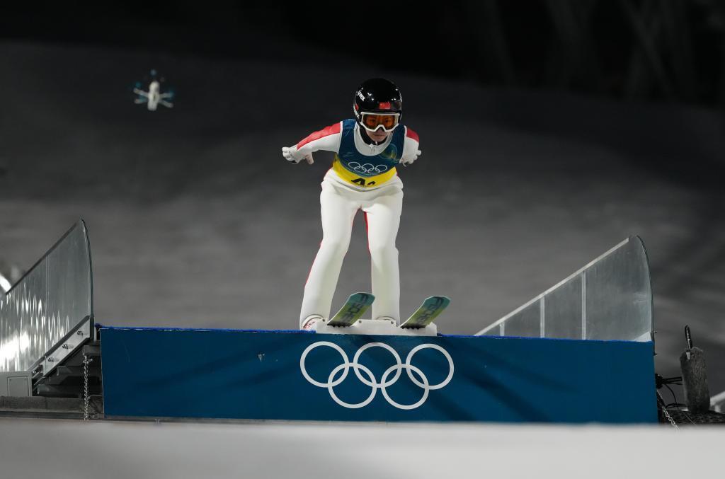 2026年2月10日,中国队选手刘奇在米兰-科尔蒂纳冬奥会跳台滑雪项目混合团体比赛中。图源:新华社
